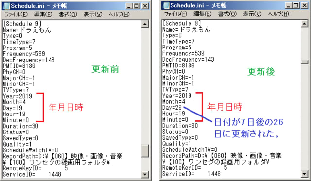 録画の予約データが記録されているのは、Schedule.iniというテキスト形式のファイルです。 この中に、予約の日付、時刻のデータがあります。